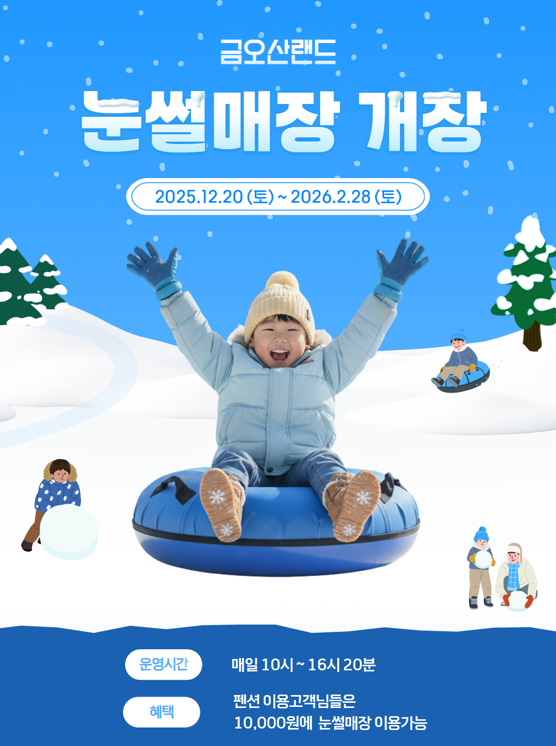금오산랜드는 여름에는 물썰매장, 겨울에는 눈썰매장, 특별한 추억을 남길 수 있는 캠핑장까지, 잊지못할 추억을 만들어드리는 곳입니다.